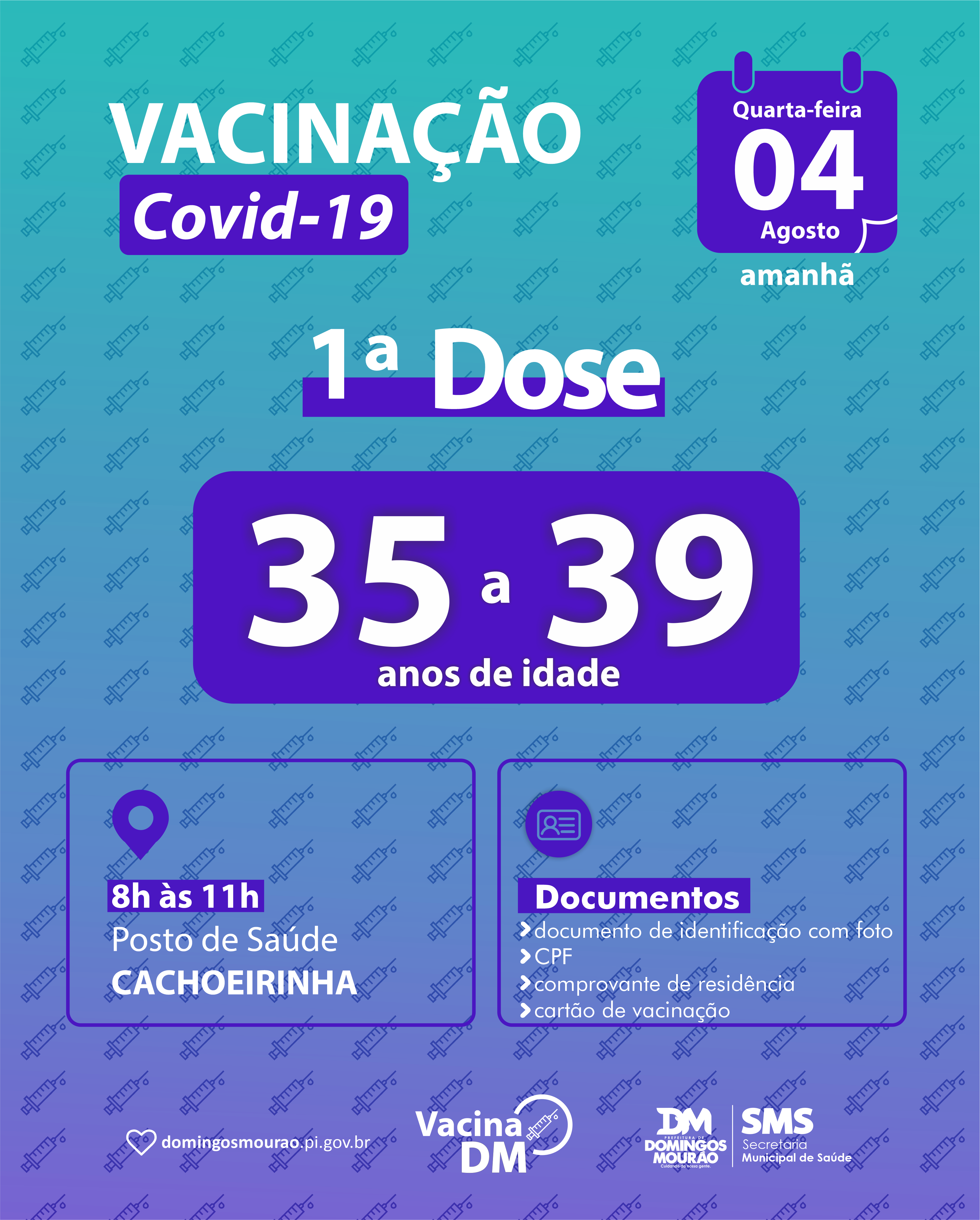 Amanhã, dia 04 de agosto, seguiremos com o cronograma de vacinação contra a covid-19.