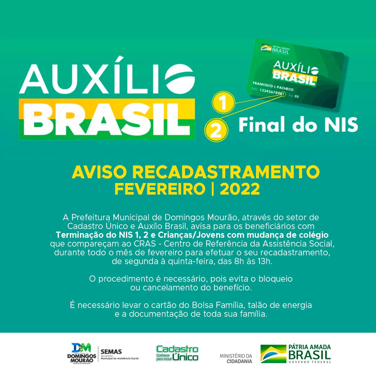 A Prefeitura Municipal de Domingos Mourão, por meio do setor de Cadastro Único e Auxílio Brasil, comunica para os beneficiários com Terminação do NIS 1, 2 e Crianças/Jovens com mudança de colégio, que compareçam ao CRAS de Domingos Mourão durante todo o mês de fevereiro para efetuar o seu recadastramento.