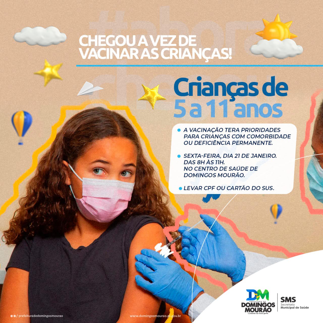Início da campanha de vacinação contra a covid-19 para crianças de 5 a 11 anos de idade. Lembramos que a vacinação terá prioridades para crianças com comorbidades ou deficiência permanente.