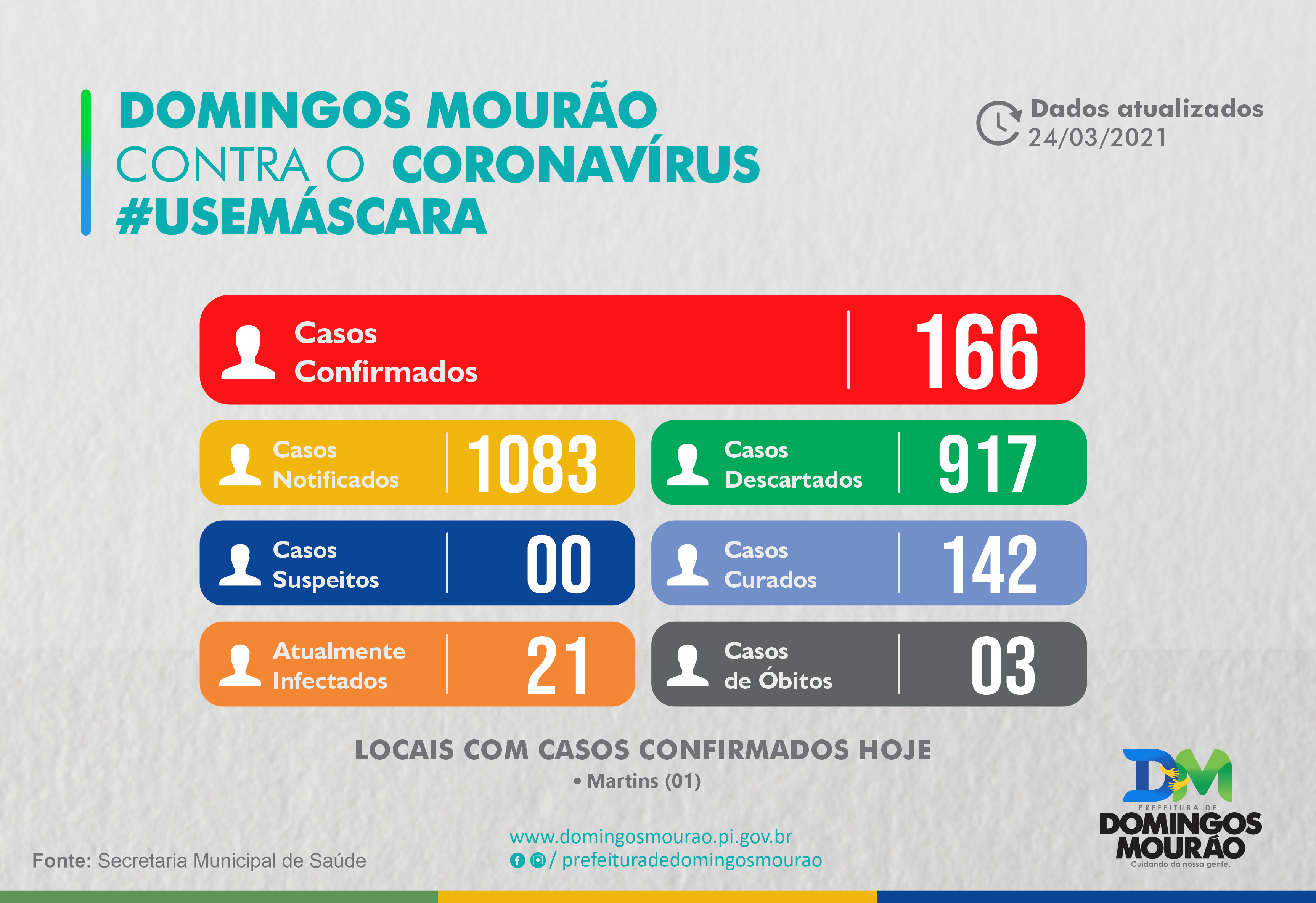 Na data de hoje (24), realizamos 20 testes rápido da Covid-19 no município, e infelizmente tivemos a confirmação de mais 01 caso positivo da doença registrado na localidade Martins.