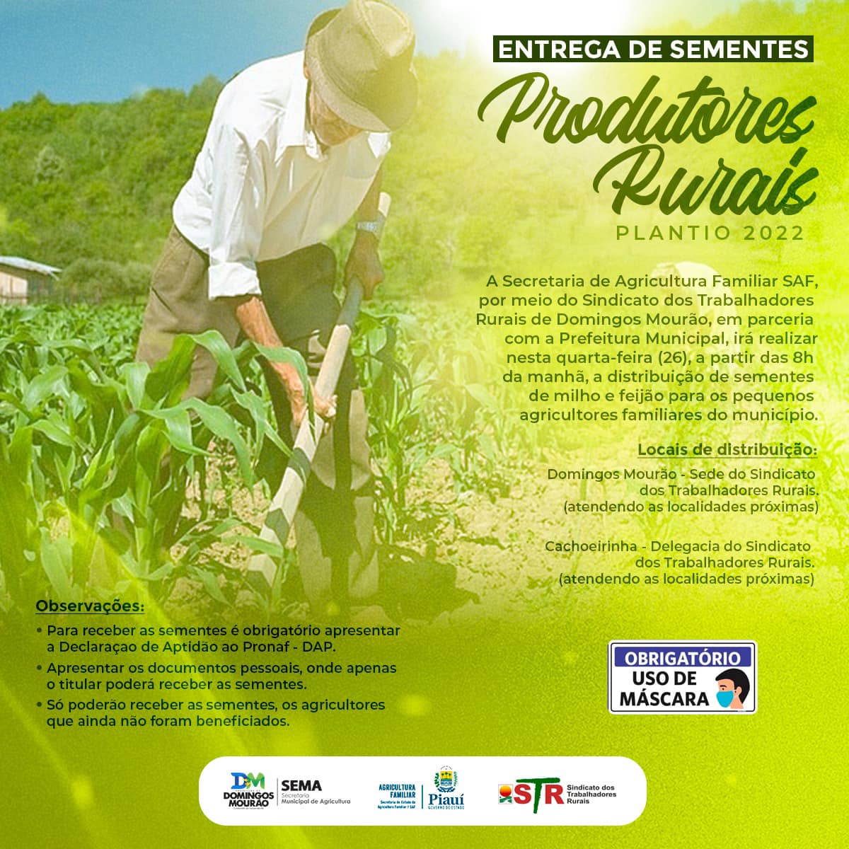 Amanhã, quarta-feira, dia 26, a Secretaria de Agricultura Familiar do Piauí, por meio do Sindicato dos Trabalhadores Rurais de Domingos Mourão, em parceria com a Prefeitura Municipal, irá realiza a entrega de sementes de milho e feijão para os pequenos agricultores familiares do município para o plantio 2022.