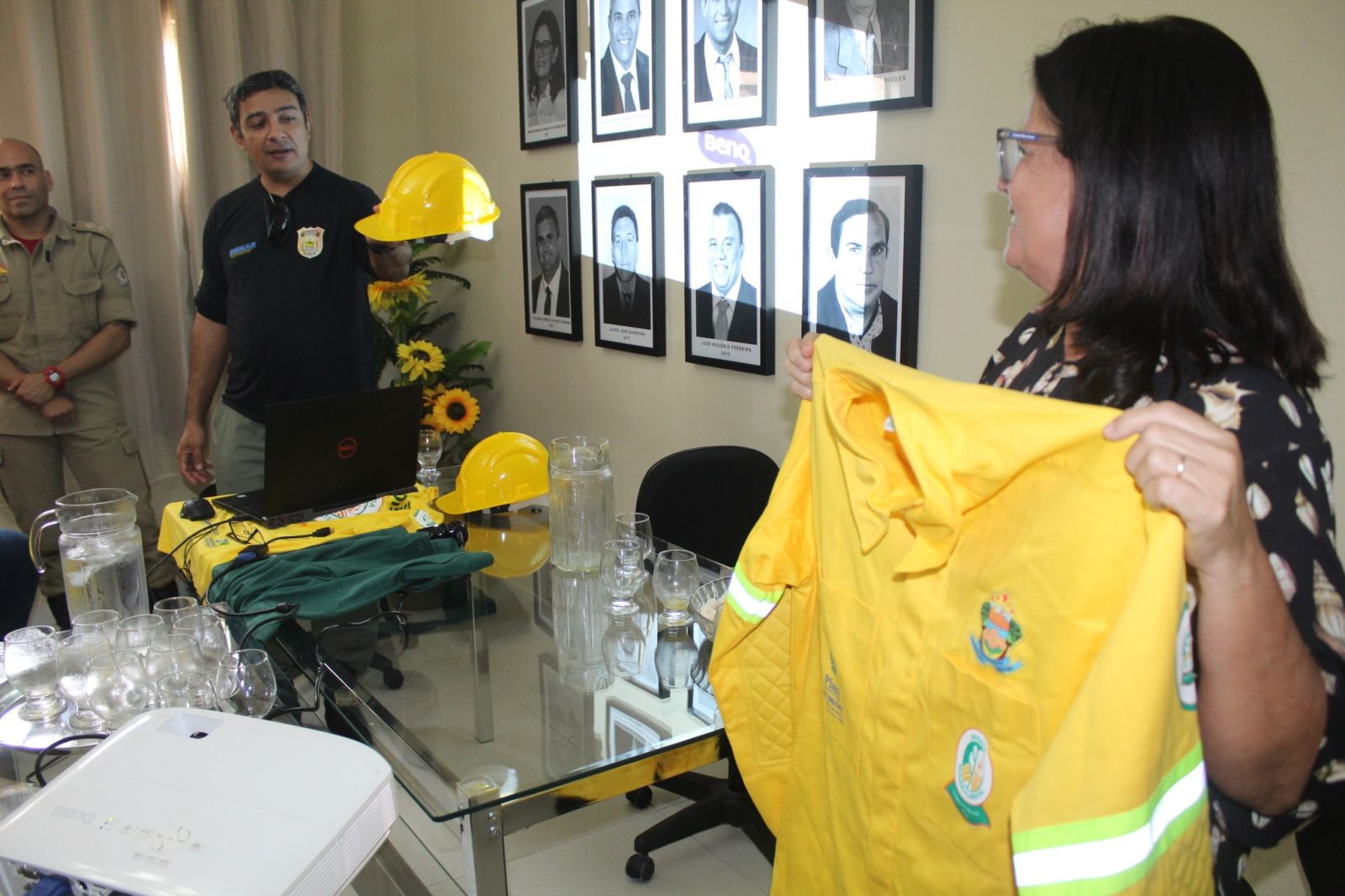 A prefeita Nelda Gomes, juntamente com o vice-prefeito Ricardo Fabrício, apresentaram para os agentes o uniforme de combate.