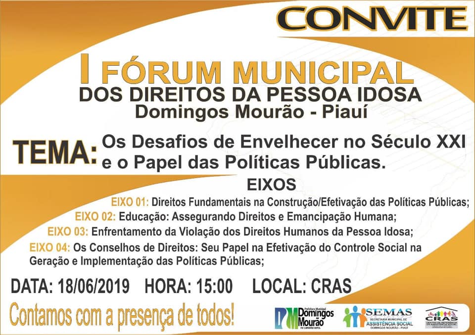 A Prefeitura de Domingos Mourão, através da Secretaria Municipal de Assistência Social, tem a honra de convidar a população em geral do município para participar do I Fórum Municipal dos Direitos da Pessoa Idosa, a realizar-se nesta terça-feira, dia 18, a partir das 15h, na sede do CRAS de Domingos Mourão.